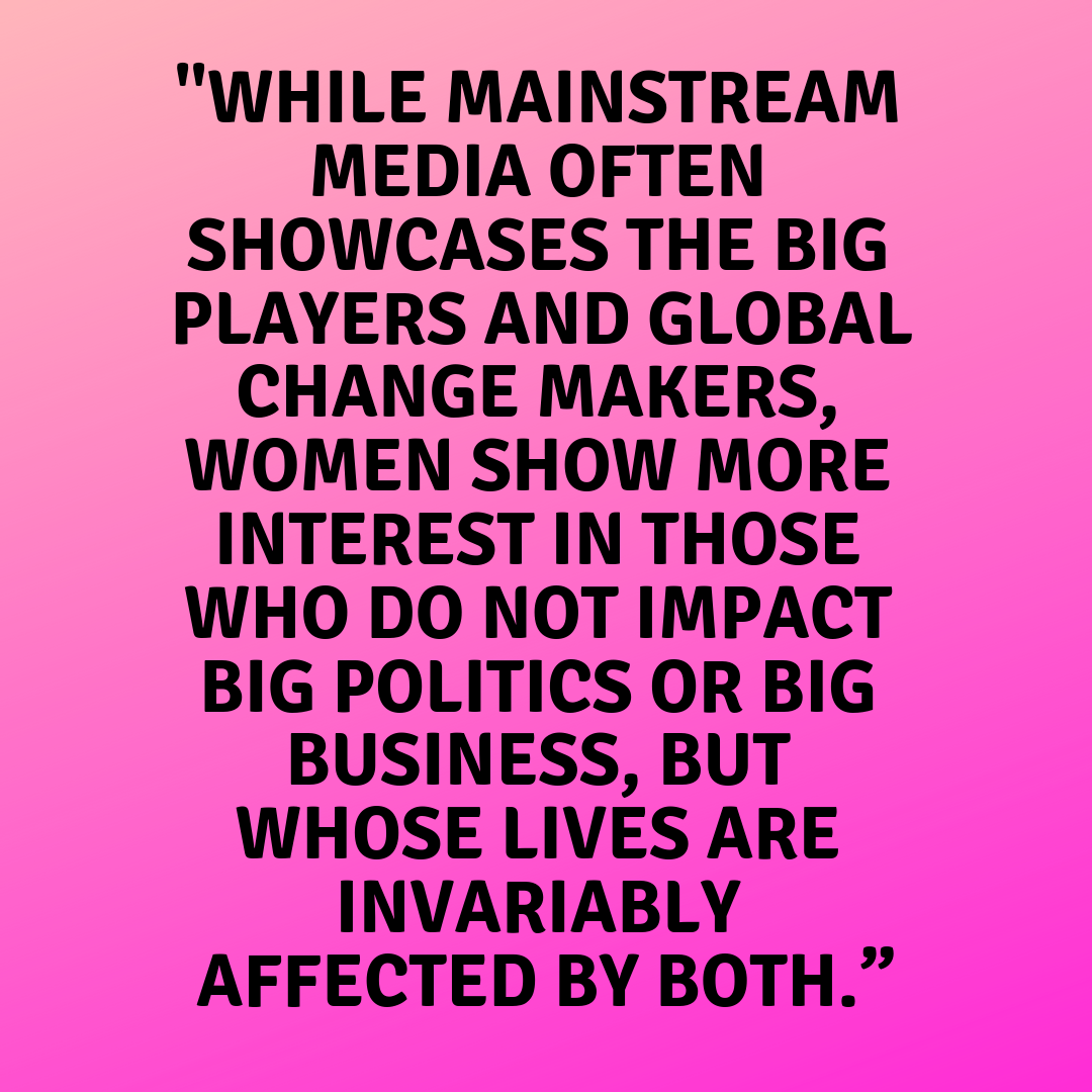 “While mainstream media often showcases the big players and global change makers, women show more interest in those who do not impact big politics or big business, but whose lives are invariably affected by both.” On an experiment to launch a site where experienced female journalists curate the news.
